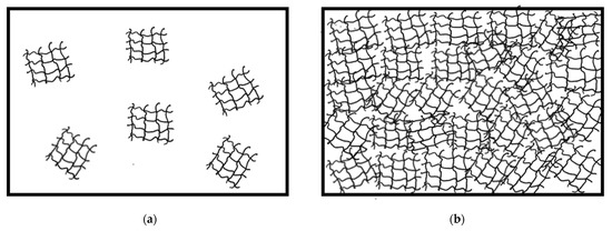 However, the MPT measurements indicated that the network formation set in at thickener concentrations as low as 0.5 wt %. At this concentration, time-independent MSD values and MSD traces monotonically increased over time simultaneously, i.e., some tracers were trapped in an elastic environment, whereas others were diffused in a weakly viscoelastic liquid. This indicates that crosslinked network structures exist as precursors for forming a sample-spanning network, formed at 6 wt % thickener concentration. The MSD values shown in Figure 11b are average values calculated from the individual trajectories, averaging 60 tracer particles per image. The scatter of MSD traces within one image, however, was low; either all trajectories were time-independent, or they increased over time (see Figure A2). The size of these images is 127 × 127 µm, and thus, we conclude that the network nuclei floating in the base oil had a typical length of about 130 μm. The different structures in the 0.5 wt % and 6 wt % samples are schematically shown in Figure 13.