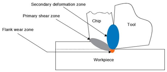 Machining is a very necessary aspect of manufacturing. It involves a group of processes that consist of material removal and surface modifications of a workpiece after different methods have been used [,]. Almost all the energy generated during metal cutting is transformed into heat []. Heat is produced at the cutting point from three sources: (i) the primary cutting areas, in which much of the energy is transferred to heat; the (ii) secondary deformation area at the tool-chip interface, where additional heat is produced by rubbing or shearing; and (iii) the strained flanks, owing to rubbing between the tool and the finished surfaces [,,]. Figure 1 shows the heat dispersion in the workpiece, cutting tool and chip during an orthogonal cutting operation. The heat deposits are destructive to the tool, the workpiece, and the machine tool []. In addition, the heat produced while cutting metal leads to tool wear, resulting in higher workpiece surface roughness [,]. Another reason for cutting tool failure is thermal cracking due to expansion and cracking induced by extreme temperatures [,]. Moreover, crater and flank wearing on the face after some time reduces the weight of the cutting tool []. High temperatures during and after machining eventually cause damage to the surface due to oxidation, burns, and rapid corrosion at the cutting area, resulting in dimensional inaccuracy of the workpiece due to thermal distortion and expansion-contraction [,,]. The friction or wear between the tool and work is minimized by lubricants, and coolants transport the heat produced during metal deformation [].