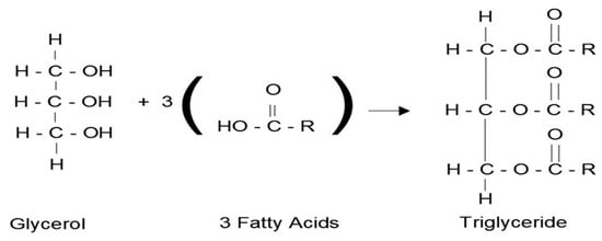 The molecules of vegetable oils are composed of glycerol and fatty acids []. A glycerol molecule is bound to three long chains of carbon atoms to make one vegetable oil molecule, as shown in Figure 2 [,,]. In almost all vegetable oils, the component alcohol (glycerine) is the same. The free formation of fatty acids in vegetable oils tends to provide a desirable quality for the lubricant []. The R classes of polar fatty acids give high-strength adhesive films that bind strongly with metal parts, reducing wear and friction [,]. Powerful intermolecular forces are often resistant to variations in temperature that provide a steadier viscosity or a higher viscosity coefficient []. The similarity of all vegetable oil structures ensures that a small range of viscosities can be obtained for their possible use as lubricating oils []. Intermolecular forces interactions thus supplying a long-lasting lubricant film often contribute to low-temperature characteristics []. Vegetable oils often have a high flash point, which eliminates smoke and fire risks. The high flash point enables the use of the cutting fluid under elevated temperatures [,]. As a consequence, vegetable-oil-based fluid meets the criteria for lubrication properties and holds great potential for application []. Table 1 shows the comparison of two base oils’ properties.