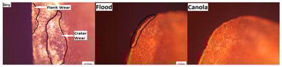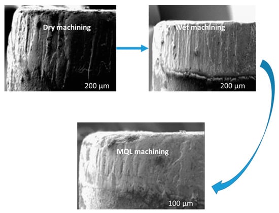 Khan et al. [] employed an MQL metal-cutting strategy in turning AISI 9310 steel with non-coated tool material while contrasting with flood cooling and dry conditions with respect to chip tool boundary temperature, chip forming mode, surface roughness, and tool wear. MQL was supplied with a mist of food-grade vegetable oil and air at a flow rate of 100 mL/h and air pressure of 6 bar while flooding was operated at 6 L/min and 0.5 bar using Eco cut San 220 coolant. Lower surface roughness decreased cutting temperature and better chip formation was reported for with MQL when contrasted with dry and flood cooling. The chips formed with MQL using vegetable oil were constantly observed to be better than flood and dry cutting at any chosen feed rate. The desired continuous chips with MQL application were due to the drop in temperature, the existence of an enabled chip–tool interface and the removal of even traces of built-up edge formation. The pattern and level of wear formed at different tool-tip surfaces after being used for a moderately long period under SEM were likewise observed to see the impacts of various conditions on the wear of the SNMG-type carbide insert. Abrasive scratch marks appeared in the flanks under all the environments (see Figure 3). The insert contained several indicators of adhesive wear. Under dry and wet conditions, severe groove wear on the flank surfaces was found in the insert. Under dry machining, plastic distortion and micro-chipping were found to have occurred. Effective temperature control with MQL through vegetable oil almost decreased groove wear development at the main cutting edge just as well as the auxiliary cutting edges. Moreover, the image clearly demonstrates diminished average wear on the primary flank and average wear on the auxiliary flank under MQL by the vegetable oil condition.
