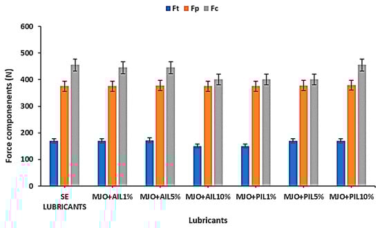 Sani et al. [] researched the impact of modified Jatropha oils (MJO) during AISI 1045 steel turning with uncoated inserts (cermet) using the MQL procedure. The machining executions of the newly evolved vegetable-oil-based metal cutting fluids were assessed with respect to tool life, cutting temperature, surface roughness, and wear action. The findings were contrasted with a commercially engineered ester-based fluid under a similar cutting context. In their investigation, two biocompatible and oil-miscible ionic liquids (ILs) ([N1888] [NTf2], AIL and [P66614] [1(C8)2 PO2], PIL) were applied as fluid-form added substances (additives) into the processed, synthesized modified-Jatropha-oil-based ester. The added substances were blended to form MJO with three unique concentrations (1.0, 5.0, and 10.0 wt.%). A variability in cutting forces and surface roughness, along with the related modes of tool failure found during the machining at a certain set of feed rate, cutting speed, and depth of cut under MQL, is shown clearly in Figure 5, Figure 6 and Figure 7. The authors inferred that among the ILs included, MJO +AIL10%, MJOs had superior lubricity with excessive viscosity.