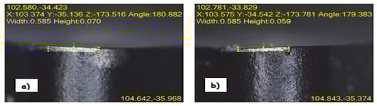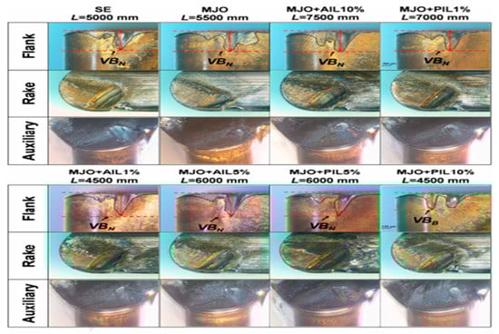 Ghatge et al. [] studied the impacts of nano mixtures of plant oils (neem and coconut oils) and mineral oil as coolants in enhancing the processability of duplex stainless steel in turning operation with covered carbide inserts (TiN-Al2O3-TICN-TiN). Studies were designed using the orthogonal array of Taguchi’s L27 by adjusting four parameters at three main levels. Cutting speed (200, 150, 100 m/min), feed rate (0.3, 0.2, 0.1 mm/rev), DOC (1.2, 0.8, 0.4 mm), and cutting fluids (coconut, neem and mineral) were the process parameters used. Cutting force, wear of the tool, and surface roughness were tested and evaluated through the main effects plot for optimal operational parameters. Eco-sustainable nanoemulsions were formulated by blending every vegetable oil with water, base oil, and non-ionic Tween80 (HLB-15) surfactant. The authors stated that the optimal tool wear, surface roughness, and tool temperature values were, for neem oil, 0.4 mm, 0.3 mm/rev, and 100 m/min, and for coconut oil, 0.8 mm, 0.1 mm/rev, and 100 m/min, respectively. The experimental outcome showed abrasive wear in the worn structure. This abrasive wear was on the tool flank surface, thereby causing flank wear. The images of tool wear generated while machining are shown in Figure 9. The two images displayed are for machining levels (7 and 25, respectively).