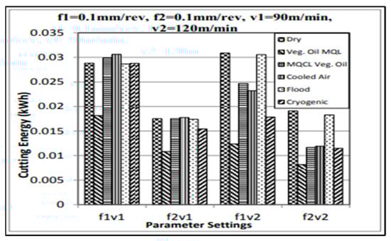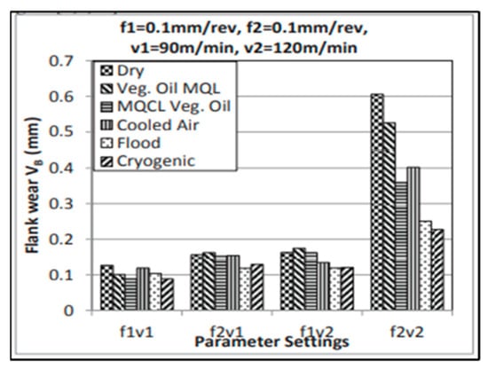 Deiab et al. [] worked on tool wear, cutting energy, and surface roughness in titanium alloy turning with different coolant environments. The results were compared under the following conditions: dry, flood cooling with synthetic emulsion, MQL with rapeseed vegetable oil, MQCL (rapeseed oil and cooled air), cooled air, and cryogenic cooling with liquid nitrogen. Figure 10, Figure 11 and Figure 12 show the average performance of the lubrication strategies. The interventions of vegetable oil MQCL and MQL provided good outcomes in terms of surface roughness and tool wear and often improved in terms of minimizing energy usage. Sustainable effects such as improved surface quality, reduced energy usage, and less tool wear resulted due to the effective supply of coolant and strong lubricity in these techniques. MQCL (rapeseed oil and cooled air) is extremely encouraging, particularly at lower speeds and feeds, thereby indicating that the use of vegetable oil in machining is a safe method compared to others. The authors concluded that MQCL with vegetable oil provided the best potential in terms of flank wear at low speed and low feed. Vegetable oil (MQCL) has emerged as a viable option together with cryogenic machining.