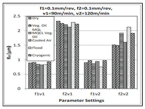 Singh et al. [] directed analyses on the capability of mineral and vegetable oils on surface roughness during turning of EN31 steel under MQL and dry environments using three typical cutting inserts (CNMG120412, CNMG120408, and SNMG120408). Both mineral oil and vegetable oil (soybean) were conveyed as mist MQL targeted at the rake face of the tool at a specific pressure of 5 bar. It was noted that vegetable oil was superior to mineral oil as concerns surface finish. The decrease in surface roughness owing to vegetable oil was around 1–10% contrasted with mineral oil. The report revealed that with MQL the surface roughness was diminished by 20–40% when contrasted with dry machining due to the lubricity, evaporative cooling, and hydrogen embrittlement activity of vegetable oil.