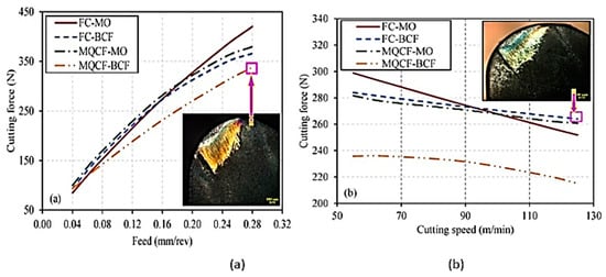 Variation of cutting force with (a) feed and (b) cutting speed for FC and MQCF [], License Number: 5287301340048.