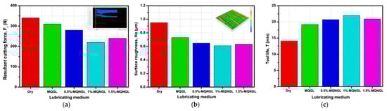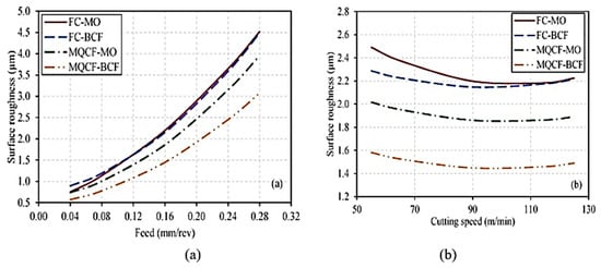 The pressurized mist was forcefully pumped into the chip–tool interface after the steady blending of cutting fluid and compressed air in MQCF. The study findings showed that the efficiency of the MQCF mist is better compared to that of FC, due to the increased capacity of mist cutting fluid in the tool–chip boundary. The surface roughness resulted in an increment with increasing feed, regardless of the cutting fluid application procedure (Figure 14a,b). On account of FC, due to high friction and adhesion at the tool–chip boundary, the machined part produced a higher surface roughness. Surface roughness of the workpiece was lower when machined with MQCF, in view of the reduced feed and cutting forces. This may cause similarly less tool chatter, prompting better surface finish, i.e., low surface roughness. From the trial results, coefficient of friction, cutting force, surface roughness, and feed force were diminished with MQCF (for both cutting liquids) compared with FC. Because of its better lubrication and cooling properties, BCF produced preferred outcomes over MO. The authors concluded that BCF emulsion performed better than MO regarding its high specific heat, higher temperature conductivity, and better capacity to infiltrate the tool–chip boundary.