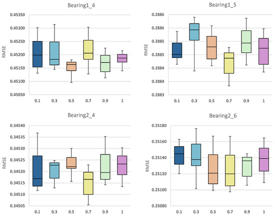 Herein, the experiments are taken as 0.1, 0.3, 0.5, 0.7, 0.9, 1, respectively. Bearing 1_4, bearing 1_5, bearing 2_4, and bearing 2_6 are used as the test set and RMSE is used as the model predictive ability index. For each series of experiments, we repeat the experiment ten times and report the average performance. Figure 3 depicts the box plot of RUL prediction results for four different bearings at different .