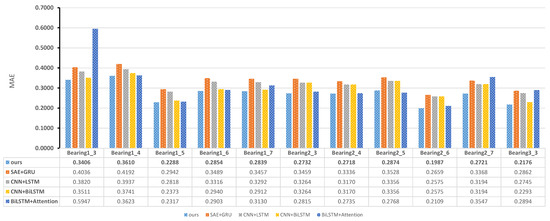 In this section, our proposed HNCPM is compared with the state-of-the-art novel rolling bearing health-prediction methods based on CNN and BiLSTM models [41], and BiLSTM with attention mechanism [42]. In addition, we compare general encode and regression model combinations (i.e., SAE+GRU, CNN+LSTM) to evaluate the model prediction performance. MAE is used as the predictive ability index of the models. The overall RUL prediction results using the aforementioned models are depicted in Figure 5.