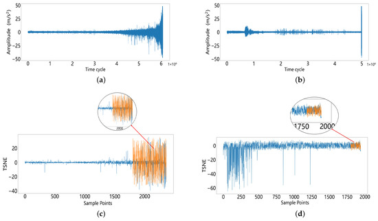 (a) Bearing1_3 data set; (b) bearing2_3 data set; (c,d) are the prediction fitting curves of TSNE corresponding to (a,b), respectively. The blue represents the real data; the orange represents the prediction.