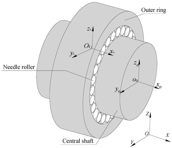When the bearing is working, the central shaft is fixed. Therefore, it is assumed that the central shaft is connected with the ground in the dynamic analysis, and only the outer ring rotates together with the action of the cam. The axis of rotation is along the X direction. The center of mass of each component coincides with the center of gravity, and the surface of the component is an ideal surface. In order to establish a dynamic model of the bearing, the following three coordinate systems, shown in in Figure 1, were defined: is a fixed coordinate system; is a coordinate system of the outer ring; and is the center of the mass coordinates of the needles.