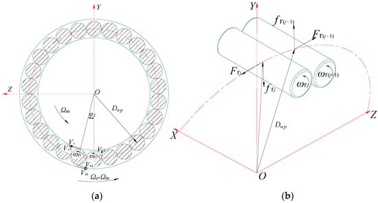 where the subscript ‘i’ represents the central shaft; ‘o’ represents the outer ring; ‘r’ represents the needle roller; ‘j’ represents the needle number; is the angular velocity of the needle roller; Dwp is the center diameter of the needle roller group; and Dw is the needle diameter.