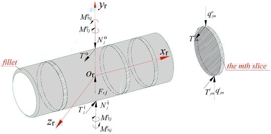 As shown in Figure 3, and are the normal contact forces between the jth needle and the raceway. and are the traction forces between the jth needle and the raceway. and are the moments caused by the normal contact force. and are the moments caused by traction forces between the jth needle and the raceway. is the centrifugal force of the jth needle roller; , are the normal contact forces between the mth needle roller and the raceway. , are the traction forces between the mth needle roller and the raceway. n is the number of slices of the needle roller. The calculation of the forces and moments can then be carried out [].