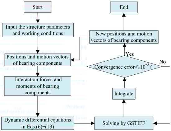 The Fortran language was used to program the bearing element interaction force and bearing friction power consumption calculation custom subroutines, and to link the rocker arm full-type needle bearing to complete the simulation analysis modules. The solution procedure of the dynamics differential equations is shown in Figure 4. The initial conditions of dynamics differential equations—namely, the relative position and the motion vector of various components—are obtained based on the initial estimated values of the bearing component’s position and motion constraint. Then, the dynamic differential equation of the rocker arm full-type needle bearing is established, and the Gear stiff (GSTIFF) integer algorithm with variable steps is used to solve it. Equations (6)–(13) can be solved by the GSTIFF variable-step integration algorithm to obtain the dynamic characteristics of the bearing. To verify whether the error meets the convergence error set, it was set to 1 × 10−3. If “yes” (see Figure 4), the process continues to the next solution after obtaining the outputs of the motion parameters. If “no” (see Figure 4), the process is to choose a smaller step value and repeat the solving until the solving error meets the convergence error. Finally, the frictional power consumption of the rocker arm full-type needle bearing is calculated by Equations (14)–(19).