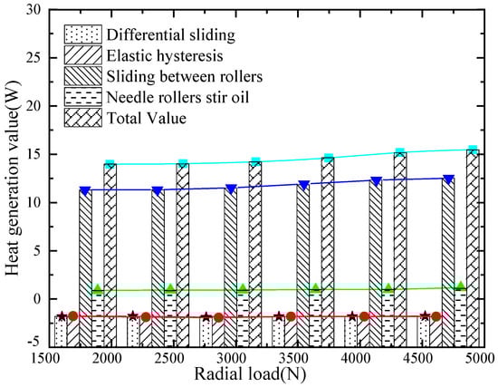 In order to analyze the value of frictional heat, the outer ring initial speed was set as 7000 rpm, and the radial force was 2000 N~4500 N. The initial radial load was set as 3000 N, and the outer ring speed was 4000 rpm~9000 rpm. By solving the dynamics model, the minimum oil film thickness, the force of adjacent rollers, the half width of the contact area, and the contact force of the bottom roller can be calculated. The results obtained from the dynamic simulations are shown in Table 2. Furthermore, the partial and overall frictional heat can be extracted during the stable working of the full-type needle bearing. Figure 5 and Figure 6 depict the variations, in average values with working conditions.