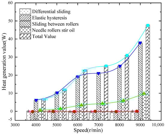 From the perspective of the change in heat generation with working conditions, the change in speed has a braking effect on the change in heat generation. Due to the gradual increase of the lubricating oil film thickness with the increase of the speed and the centrifugal force of the rolling elements, the value of the heat generated also gradually rises. However, the change in radial load barely affects the change in frictional heat generation. The frictional heat generation rises slightly with an increase in radial load.