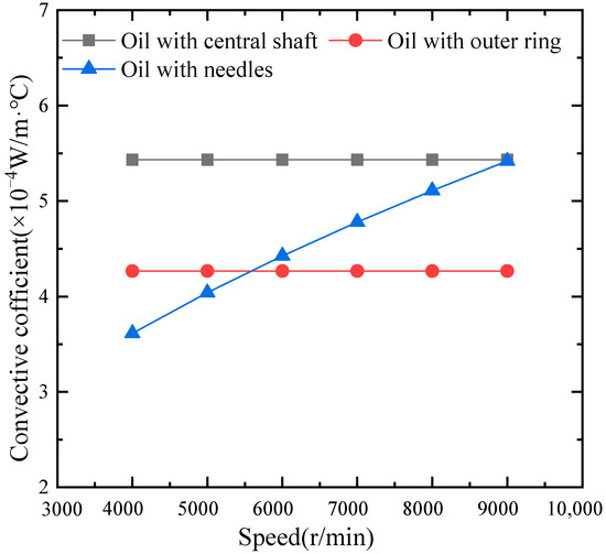 For a bearing system, heat convection mainly includes the convection between the lubricant and the surface of the inner or outer raceway and the convection between the lubricant and the surface of the needle rollers. When the lubricant is oil, the performance of the lubricating oil film has a greater impact on improving the working conditions and the service life of the bearing; the convection of the lubricating oil film in the contact area should also be considered. The convection coefficient can be approximately calculated by Equations (20)–(21).