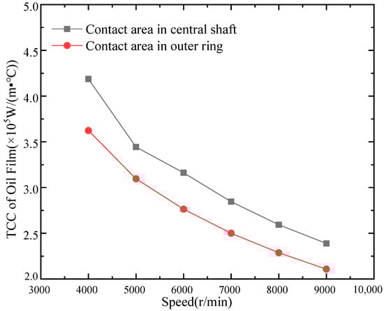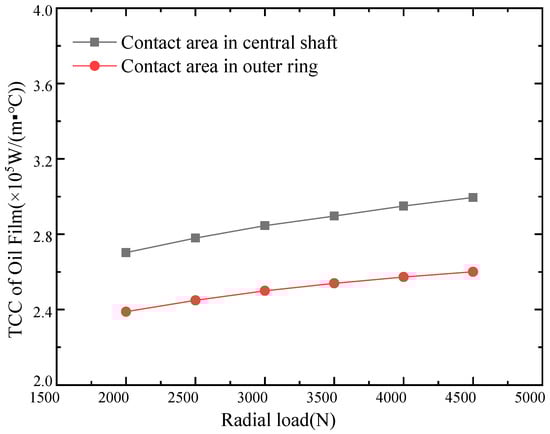 During the rotation of oil-lubricated bearings, the two friction pairs between the contact areas are often separated by a layer of oil film to reduce friction and improve the bearing capacity of the bearing. Therefore, it is necessary to consider the thermal conductivity coefficient of the contact oil film between the needle roller and rings of the bearing. The changes of the thermal conductivity coefficient with the radial load and the outer ring speed are shown, respectively, in Figure 9 and Figure 10.