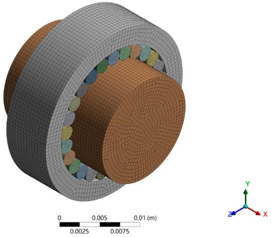 In ANSYS Workbench, the bearing is modeled and meshed according to known parameters. The finite element model of the bearing is meshed by a mapping method. The meshing produces a total of 114,578 elements and 525,468 nodes. The divided model is shown in Figure 11.