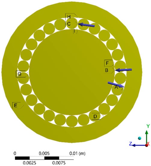 Because the bearing is a symmetrical rotating assembly, each needle roller has the same form of heat generation and heat transfer during high-speed rotation. It is assumed that the axial thermal characteristics of the system are consistent, and that the heat transfer only occurs in the radial direction []. In the working process, forced convection occurs between the lubricating oil and the needle rollers, as well as in the inner and outer raceway surfaces of the bearing. Natural convection occurs between the contact area of the end of the central shaft and the outside part of the shaft with the outside air. The friction heat generated by the bearing is evenly distributed to the needle roller and the ferrule, in a ratio of 1:1 [].