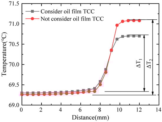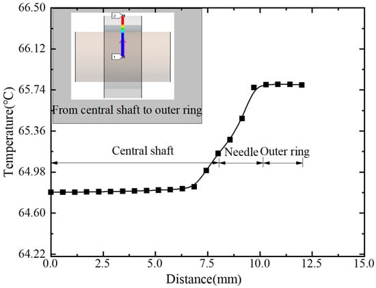 In order to analyze whether the convective coefficient of the lubricating oil film affects the heat dissipation inside and outside the bearing, a “path” from the center of the central axis along the positive direction of the Y axis to the outer surface of the outer ring could be set. In addition, the temperature on the “path” could be studied under the two conditions of the oil film convective coefficient and no-oil film convective coefficient. The law of change is shown in Figure 13. It can be seen from the temperature distribution that, due to the compact structure of the needle roller bearing, the temperature difference between the internal parts of the bearing was small. The temperature range of the bearing had the same distribution in each needle and contact area, and only changed in temperature along the radial direction.