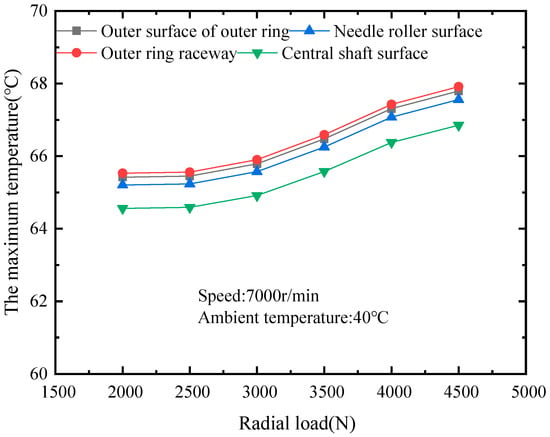 Figure 14 shows the effect of different radial loads on the maximum temperature when the outer ring rotated at a speed of 7000 rpm and an initial temperature of 40 °C. It can be seen that the maximum temperature rise was in the outer ring raceway. The maximum temperature value gradually decreased from the outer ring raceway, the outer surface of the outer ring, and the needle roller surface to the central shaft surface. The radial load had no effect on the heat generation of the needle roller bearing. Therefore, under the radial load of 2000 N~4500 N, the temperature of the bearing gradually increased, and the maximum temperature value was between 65 °C and 70 °C.