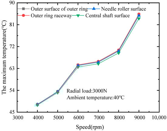 Figure 15 shows the influence of different speeds on the maximum temperature at a radial load of 3000 N and an initial temperature of 40 °C. It can be seen that the maximum temperature rise was also in the outer ring raceway. The maximum temperature value gradually decreased from the outer ring raceway, the outer ring outer surface, and the needle roller surface to the central shaft surface temperature. When the speed was 9000 rpm, the maximum bearing temperature was 85 °C.