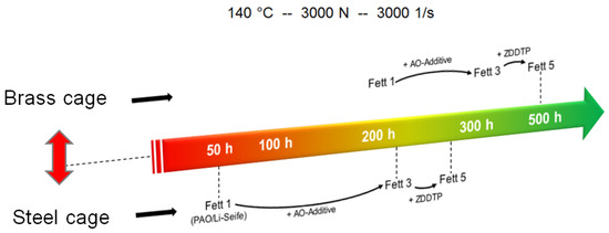 In the finished DGMK project, 788 “Screening test method for lubricating greases”, it was shown that the loss of the lubricating effect of a grease is strongly influenced by the thickener degradation (DGMK, German Society for Sustainable Energy Carriers, Mobility and Carbon Cycles e.V.) [7]. Recent publications by other scientists confirm this hypothesis and reinforce the need for research (e.g., [5,8,9,10]). In the case of soap-thickened greases, this effect has been shown to occur well before the actual base oil aging and accordingly limits service life. The catalytic effect of the cage material is apparently different—and previously unknown—than on classic oil aging (Figure 2). The current running research project aims to clarify which influencing factors ultimately play the decisive role and how the effect can be positively influenced.