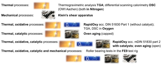 In technical applications, a wide variety of causes can lead to irreversible damage to the lubricants. Thermo-oxidative degradation depends strongly on the ambient conditions. In non-encapsulated systems, the oxidation of the lubricant leads to the formation of acids, polymers, condensates and deposits. This process depends on the temperature, the presence of catalysts such as metal surfaces or wear debris, the oxygen supply and the aging products produced. Furthermore, coking effects can occur due to the aging of the lubricating grease and thus the degradation and polymerization of the lubricating grease, but also due to insufficient lubrication, especially at elevated temperatures and high speeds [1,4]. In addition to thermo-oxidative aging, a lubricating grease is also subject to high mechanical–dynamic stress in use. The importance of the individual influencing factors was clearly shown in the recent DGMK project 788 [7].
