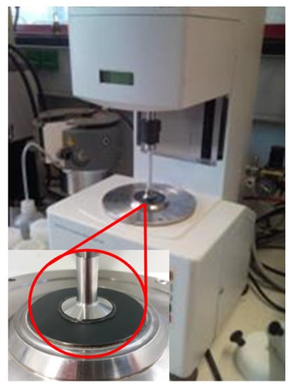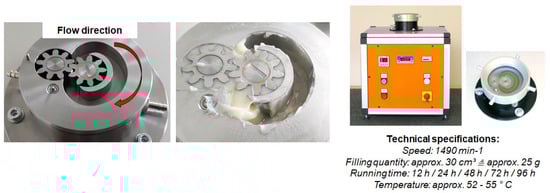 Two methods are usually used to investigate the structural breakdown of greases: One is the mechanical roll stability test, in which the grease is stressed under load and shear. A typical mechanical stability test is the “Shell roll stability test” (ASTM D 1831 [29]), in which the grease is sheared between a heavy roller and a hollow rotating cylinder at an elevated temperature (generally 80 °C). According to the literature, this test shows good transferability for wheel bearings in motor vehicles [30] and roller bearings in railroad cars [31,32]. The other test is the shear strength test, in which only a shear stress but no high contact pressure is given. This is considered important for bearings that run under relatively stable working conditions. With continuous shear, it is observed that the shear degradation of the lubricating grease leads to the release of oil and thus provides additional lubricant [33,34]. In the “grease worker” (ASTM D 217 [35]), which consists of a closed cylinder and a piston plate with a number of holes, the grease is sheared through the holes during a precisely defined number of strokes (usually 10,000 or 100,000 strokes). The disadvantage of both of the aforementioned ASTM aging methods (ASTM: American Society for Testing and Materials) is that the shear rates tend to be rather low and not precisely defined, which makes it difficult to use these methods for developing predictive aging models. For this reason, a different method of shear stress is used in the current project. With the help of the Kleins shearing apparatus (Figure 5), greases can be sheared under well-defined conditions. The grease is pumped in a circle, which works similarly to a gear pump. The change in the rheological parameters (yield point and loss modulus) is then determined using rheometer measurements.