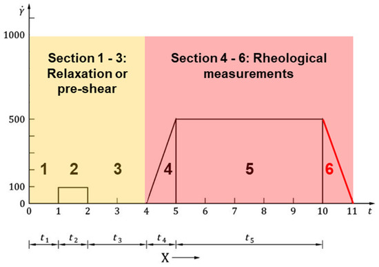 With this measuring method described in DIN 51810-1, a pre-shearing takes place first (2). After a certain relaxation time (3), the shear rate increases linearly to 500 1/s (4). There, it is then kept constant for 5 min (5). In order to determine the thixotropy, in step 6 (no standard), the shear rate is then linearly reduced to 0 again (Figure 9).