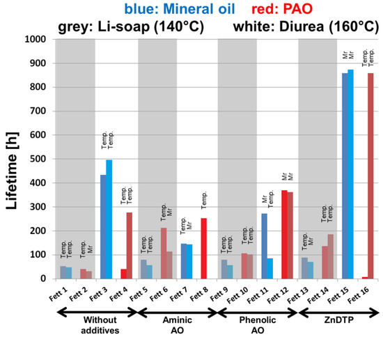 Figure 11 shows the results of the first duplicate determinations. The inscription above the bars indicates whether the test was switched off due to excessive temperature (Temp.) or excessive frictional torque (Mr). All greases with diurea as a thickener (white background) have a significantly longer test run time (despite a 20 °C higher test temperature). Mineral oil with diurea thickener (#3) shows the third longest lifetime even without additives. Surprisingly, used AO additives reduce lifetime (#7, #11). Zincdialkyldithiophosphate (ZnDTP) only works optimally for greases with diurea thickener (#15, #16).