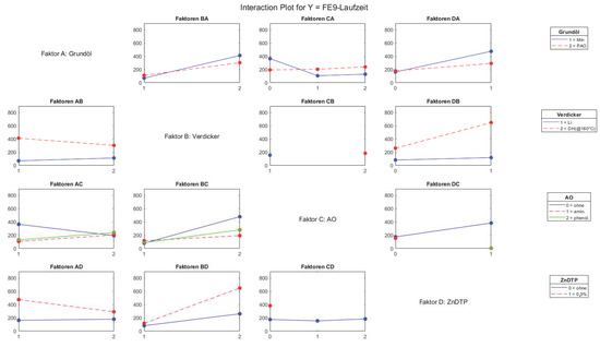 Statistical evaluation of FE9-lifetimes by interaction plot (MatLab 2021b®), exemplary representation. A high slope of the curve means a large positive influence of the factor on the running time in the FE9; a falling curve shows a negative impact.