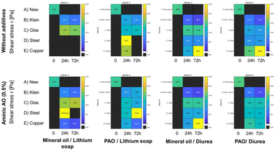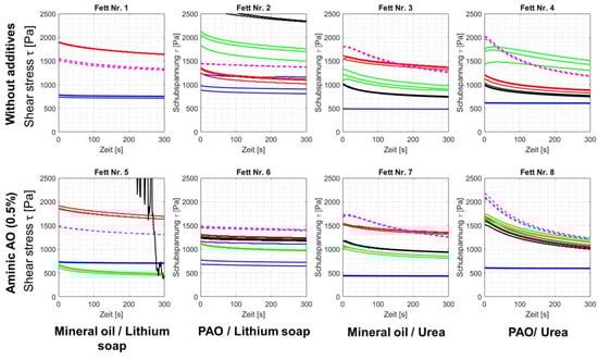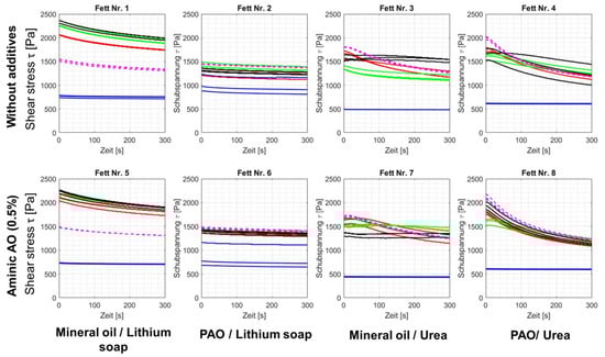 In the capped system, i.e., without direct contact with the oxygen in the air, the changes in the flow behavior of the lubricating greases are, as expected, significantly less (Figure 14). All test combinations can be measured after the treatment in the capped arrangement. In the case of greases #1 and #5, the shear stress increases during thermal/catalytic aging, with little to no detectable additive effect. The curves for the greases with and without additives are always similar. The catalytic effect of the different metal sheets is not pronounced without the access of oxygen.