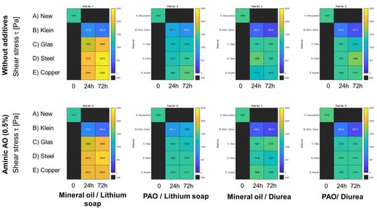 Overall evaluation of the test of open oven aging (with oxygen influence) with so-called heat maps. Top row from left to right: greases 1–4 (without additives); bottom row from left to right: greases 5–8 (with 0.5% aminic AO); top left square in a single diagram represents the new condition, 2nd column after 24 h, 3rd column after 72 h of aging/shearing.