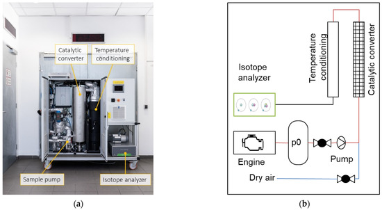 This novel method is based on measuring the ratio (1H/2H (D)) between the two stable isotopes of hydrogen, protium (“hydrogen”) and deuterium, in the exhaust gas. The average hydrogen/deuterium ratio, in nature, is 99.984 at% 1H to 0.0156 at% D. This ratio remains within small fluctuations for all substances on the earth, including fuels and lubrication oils. Increasing the deuterium (D, 2H) concentration in the lubricating oil to 2–4 at% (roughly 200 times higher compared to the natural abundance) enables a very accurate measurement of the of lube-oil consumption. The evaporated or combusted deuterium-enriched oil is carried to the catalyst as a part of the exhaust gas. The remaining oil droplets are oxidized on the precious-metal-catalyst surface, together with unburned fuel. The fully oxidized exhaust gas enters a cavity ring-down spectrometer (CRDS) Picarro—L2130-i Isotope and Gas Concentration Analyzer, which determines the hydrogen/deuterium ratio. The oil consumption is, afterwards, recalculated by setting up a mass balance, while taking into account the contributions of the oil, fuel, and intake air humidity. The path of the lubricating oil and the respective tracer, from the engine to the spectrometer, is depicted in Figure 2.