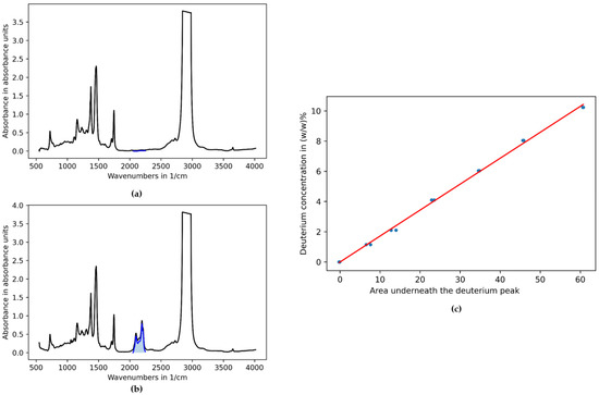 The complete IR spectrum of the lube oil: (a) without tracer; and (b) with tracer (black), including the selected area for the determination of the deuterium concentration (blue); (c) linear correlation between 2H concentration and area in the IR spectrum.