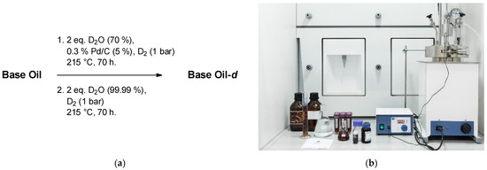 (a) Reaction scheme of deuteration of base oil; (b) 5 L pressure reactor from the company UOSLAB—UKRORGSYNTEZ Ltd.