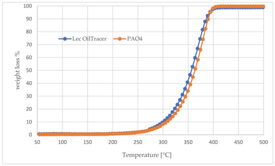 Comparison of thermogravimetry analysis of PAO4 oil and LEC OilTracer.