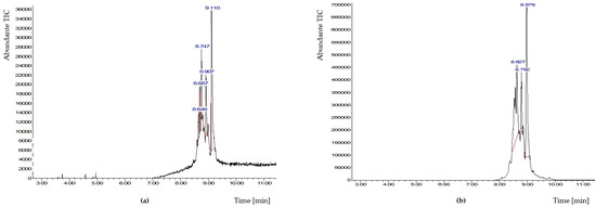 (a) GC-MS analysis of PAO4 base oil, and (b) LEC OilTracer. On the x-axis is the retention time, and on the y-axis is the total ion current (TIC).