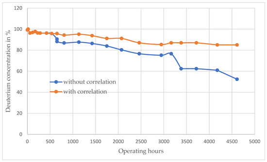 As can be seen from Figure 10, there were no significant decreases or increases in the deuterium tracer in the lube oil. The most significant decreases in the concentration are visible during the refilling of the consumed lube oil (blue curve). The consumed lube oil was replaced by fresh oil without a deuterated tracer. The sharp drops in concentration were caused by these additions (e.g., 652 h; the addition of 3 L of fresh oil; a 9% drop). The orange curve shows the deuterium concentration with the correction for these additions.