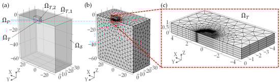 The numerical model is based on the work by Habchi [21] and Ziegltrum et al. [19,30]. Triangular and tetrahedral elements are used for the domains , , and . For , a finer mesh is used in the regions where high-pressure gradients are expected to occur, that is, within the contact area and at the location of the second pressure maximum. In the gap height direction, uniformly distributed prism elements are used, which speeds up the computation of the integral terms [21].