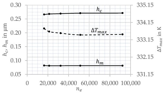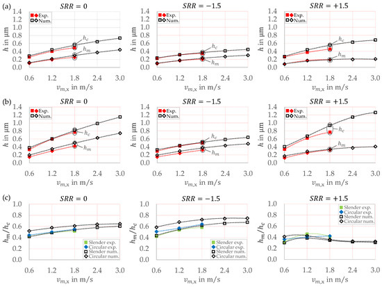 The results shown in Figure 5 and Figure 6 are further evaluated in terms of the minimum and central film thickness. In most cases, the minimum film thickness occurs in the side lobes of the EHL contact. Only at and entrainment speeds does occur along the central profile in gap length direction. The central film thickness is defined as . Figure 7 shows the values of and as well as their ratio for the slender and circular EHL contact for all entrainment speeds and slide-to-roll ratios . The entrainment speed range is extended by the numerical results for , which was not investigated experimentally. A comparison of different values for the slender EHL contact (Figure 7a) confirms that both and are lower for compared to . For , is very similar and significantly lower compared to . For the circular EHL contact (Figure 7b), the film thickness is generally higher, with very comparable trends. This is confirmed by the ratio of to in Figure 7c. Note that the ratios are very similar when comparing and , but different for . This applies to the slender and circular EHL contact under consideration and can be explained by analyzing the contact temperature and viscosity for in Section 3.2.