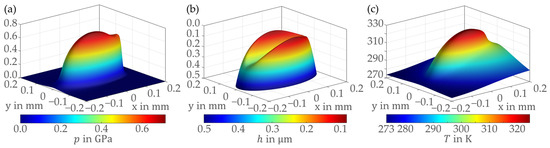 The film thickness and temperature results in Figure 3 reveal a small influence of mesh size on the TEHL solution, which converges with an increasing number of elements. A fine mesh with a total of elements was chosen for all simulations. The corresponding pressure, film thickness and temperature distributions of the slender contact test case are shown in Figure 4.