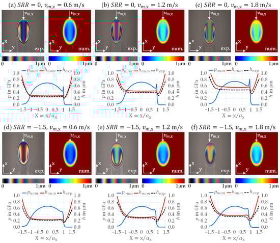 At , at which the upper glass disk moves more slowly than the lower steel roller, different trends of the film thickness are visible than at . For all three entrainment speeds, the film thickness of the slender EHL contacts at in Figure 5d–f is lower than at . This is a consequence of oil shearing and consequent temperature generation inside the oil film at . On the other hand, the film thickness features, in terms of the shape in the central region and the location of the minima, are similar to those seen at for the all three entrainment speeds. The second pressure maximum is less pronounced than at . The conclusions that can be drawn for negative in the circular EHL contact case in Figure 6d–f are almost the same; the film thickness is approx. higher in the circular contact case.
