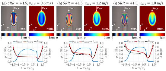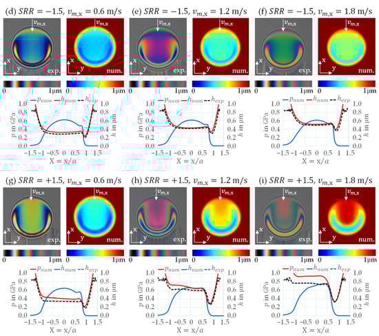 Experimental and numerical results for the circular EHL contact with different slide-to-roll ratios and entrainment speeds (subfigures (a–i)): Measured and calculated interferograms (top), derived film thickness profiles and , and calculated pressure profiles in gap length direction (bottom).