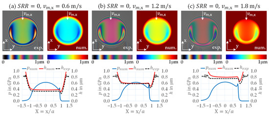 At , the film thickness interferograms and profiles for the slender EHL contact in Figure 5a–c show that the film thickness in the central region is flat and has a “U-shape”. Also, it can be seen that it reaches its minima in the side lobes regardless of the applied speed. The overall increase in film thickness with increasing entrainment speed is evident. Pressure distributions are characterized by a second pressure maximum. The described features and trends are typical for pure rolling conditions. They are also seen in the circular contact (Figure 6a–c) with the difference that the film thickness in the central region is semi-circular rather than U-shaped. Overall, at the film thickness in the circular contact is approx. higher than in the slender contact.