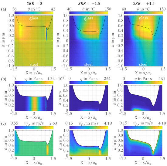 Since glass has a much lower thermal effusivity than steel (see Table 2), the glass surface has a higher temperature than the steel surface for conditions where (see Figure 8a, ). This results in the oil being more viscous in the vicinity of the steel surface (see Figure 8b, ), creating a so-called viscosity wedge [15,31]. When the steel surface moves faster than the glass surface (), the viscosity wedge is weak. The flow is less constricted, and the oil moves through the contact at higher speed (see Figure 8c, ), resulting in a lower central film thickness. When the steel surface moves more slowly than the glass surface (), the viscous oil moves more slowly through the contact (see Figure 8c, ). This is due to the strong viscosity wedge on the steel surface that constricts the oil flow in the entrainment direction. It induces additional fluid pressure (see Figure 5) and increases the film thickness in the central region. Hence, the different ratio of to when comparing and in Figure 7c is due to the unequal temperature distributions in the gap height direction caused by the different thermal effusivities of glass and steel.