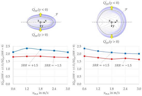 Figure 9 shows the evaluated side flow for the slender and circular EHL contact for all calculated entrainment speeds in a relative manner. Thereby, and is related to , as it constitutes a reference with negligible thermal effects. The results show that over the considered range of entrainment speeds, the side flow ratio is significantly higher at than at , and higher at than at . Since side flow is governed by the pressure driven flow in -direction (see in Equation (4)), high side flow occurs in cases where the pressure gradient is high. For , the strong viscosity wedge (see Section 3.2) results in higher fluid pressure (see Section 3.1) and gradients. For , the effect is present, but less pronounced. For , no viscosity wedge occurs.
