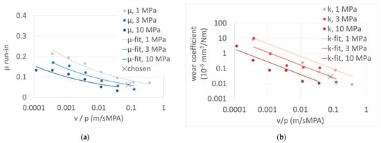 Friction and wear maps were recorded to be able to choose a mild loading scenario for the run-in condition. Mild loading should show a high transfer-film forming ability, a low but measurable wear rate and prevent frictional heating. The maps (Figure 2) were obtained from a 5-day test procedure for each system. Increasing load levels (1, 3, 10 MPa) and decreasing velocities were chosen. In this way, a continuously increasing frictional power density was applied to the frictional surface and an increasing roughness interference was achieved. The mild loading conditions at p = 3 MPa and velocity v = 0.25 m/s result in low friction values that induce a frictional heating of less than 10 K. The resulting dependence of the friction and wear coefficients could be parameterized by the chosen 3-factor model (7) and (8). Both factors had to be used to describe the transition behavior in mixed lubrication with respect to viscosity η and the mechanical interaction intensity with respect to surface hardness H for all combinations of p and v. In this context, the chosen wording “minimal” 3-factor model was validated.