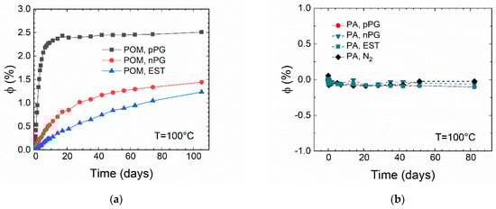 In Figure 3, the relative mass uptake versus time is shown for POM (a) and PA46 (b) during isothermal storage in the lubricant indicated or in nitrogen atmosphere (PA46) for up to 105 days at 100 °C. The time-dependence of the mass uptake is a measure of the diffusive transport (diffusion coefficient) and the equilibrium sorption for a given lubricant within the semicrystalline polymer. Both are coupled to the free volume of the amorphous phase. By fitting the data using Equation (8) (dotted lines in Figure 3a), the equilibrium values of the relative mass uptake and the diffusion coefficients are estimated for the systems that show a mass uptake (Table 3). Since the sorption–time curve of ester oil in POM cannot be fitted properly by the diffusion equation, the values for the mass uptake after 105 days of storage time are used for further interpretation and given in Table 3. is within a range of 6% to . As shown in Figure 3b for PA46, no mass uptake but a slight mass loss is detected for the organic lubricants studied as well as for storage (thermal aging) under nitrogen atmosphere. Therefore, no measurable solution of significant amounts of the PA46 or additives in the lubricants (acting as solvents) was found. The results of the sorption experiment for POM can be summarized as follows: The diffusion coefficients of the lubricants in POM increase with increasing polarity (see Table 2), and the tendency for sorption is coupled to the solving energy. As expected from the parameters in Table 2, PA46 does not show a sorption tendency in the experiments. The slight mass decrease can be explained by diffusion (extraction) of additives or degradation products (including residual water) into the lubricants.